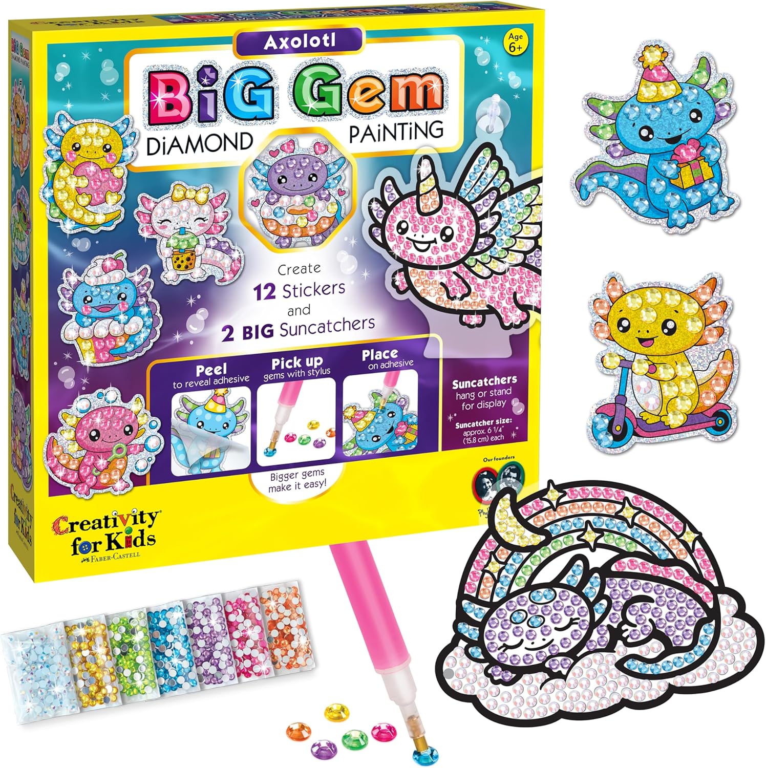 Diamond painting made simple! Larger gems and adorable designs make this activity easy and fun to do for kids and beginners. No glue needed! Just peel the clear cover off the adhesive then use the stylus to pick and place the colorful gems. Enjoy two diamond painting activities in one kit: 12 holographic stickers include printed dots for guided gem placement, while 2 sun catchers offer an open-ended design experience. Pick one of the fun themes!